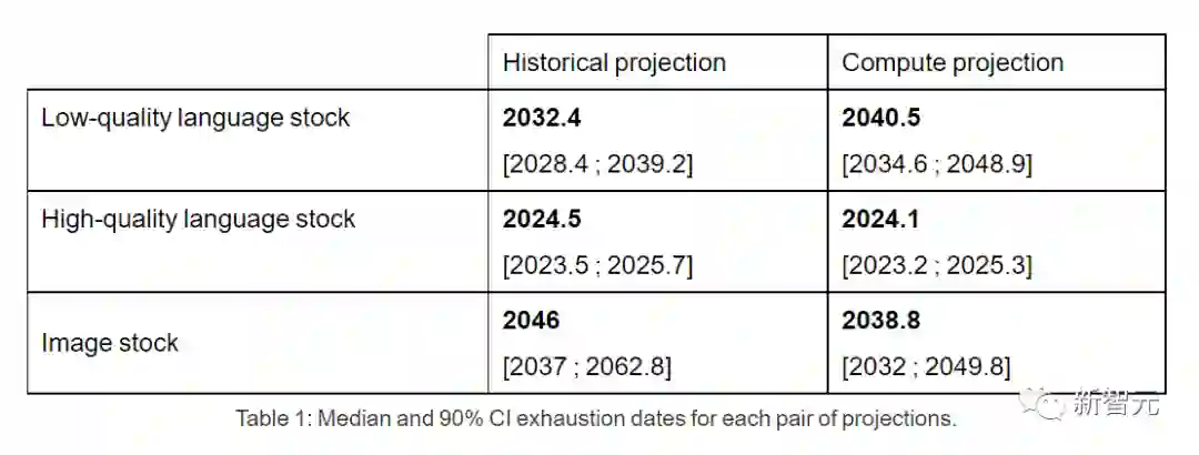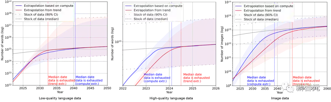 相比之下,低质量的语言数据和图像数据情况略好:前者将在2030年至2050年间用光,后者将在2030年至2060年之间。