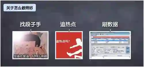 误区一:找段子手 段子手看似现在很红火,其实最红火的时间应该是在2015年,2016年段子手这个行业的生意已经没那么好了,但是现在还有很多人去找段子手,认为段子手的影响力很大,去写一个漫画或者是一个有意思的东西,然后投放到市场,让一些微博大V去转发,认为这个就是营销的成功。但是所转发的数据和你的业务转化有关系吗?带来了真正的转化了吗?