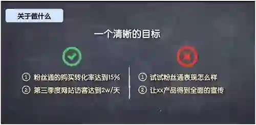 我们看看,左侧是2个清晰的方案目标,(粉丝通的购买转化率应达到15%,这个目标前要加个时间点,我们就说8月份吧)有时间点,有具体的结果。而右侧则是2个含糊不清的目标,比如让xx产品得到全面的宣传,什么叫全面的?请问什么叫全面的?如果是这样的一个含糊的目标,我又怎么去分解这样的一个目标呢?分解我的工作步骤呢?根本就无法分解,所以就导致你做的每一件事情都没有目的性。
