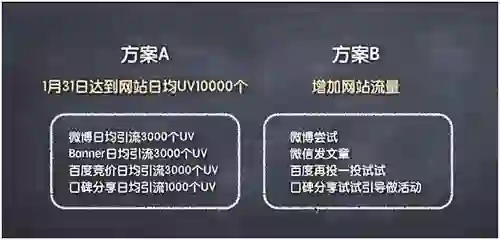 这是两个不同的方案:方案A与方案B ,方案A 的目标是1月31日达到网站日均UV(独立访客)1000个这是一个明确的目标,有时间线,有可测量的数字结果。方案B的目标是增加网站流量,这是一个不合格的目标。