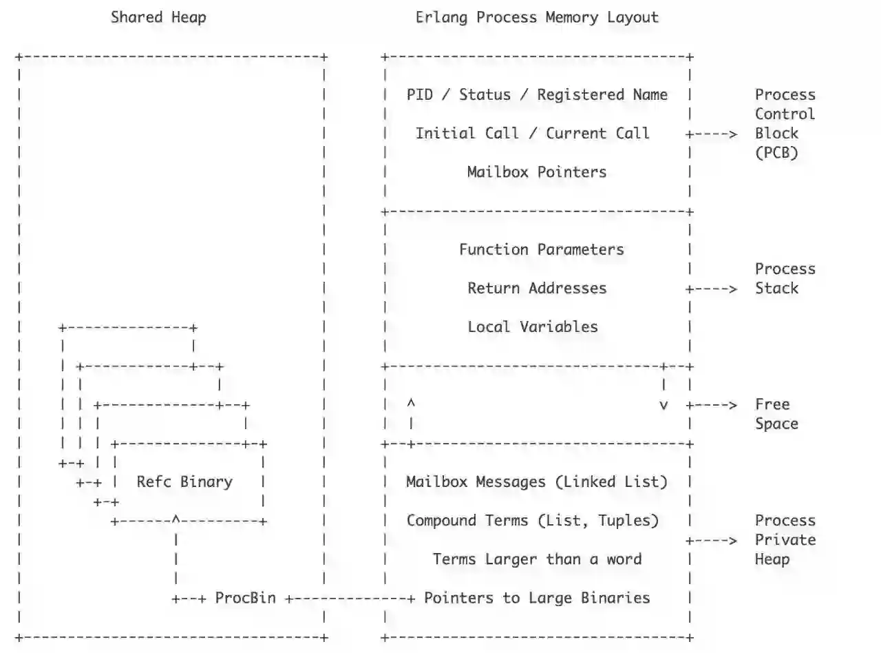 其实它和 OS 的 process 概念几乎一样,就是 PCB(Process Control Block),以及围绕 PCB 的 heap,stack,mailbox 等内存空间。只不过,erlang 的 process 的 memory footprint 很小很小,一个刚初始化的 process,也就占用几百个 words(32bit CPU 下,1 word = 4 bytes,64bit CPU,1 word = 8 bytes)。所以,erlang VM 能创建的 process 理论上取决于内存的大小,我们可以轻易创建百万级,甚至千万级的 process(32bit CPU 的 pid 用 28 bit,64 bit CPU 的 pid 用 60 bit,大家可以自行算算 process 的上限)。erlang 的 process 源自 actor model 的思想,它是几种常见的 concurrency model 的一种(其它的 model 请参考我的文章:Concurrency)。process 和 process 通过发送和接收消息来处理各种事务。