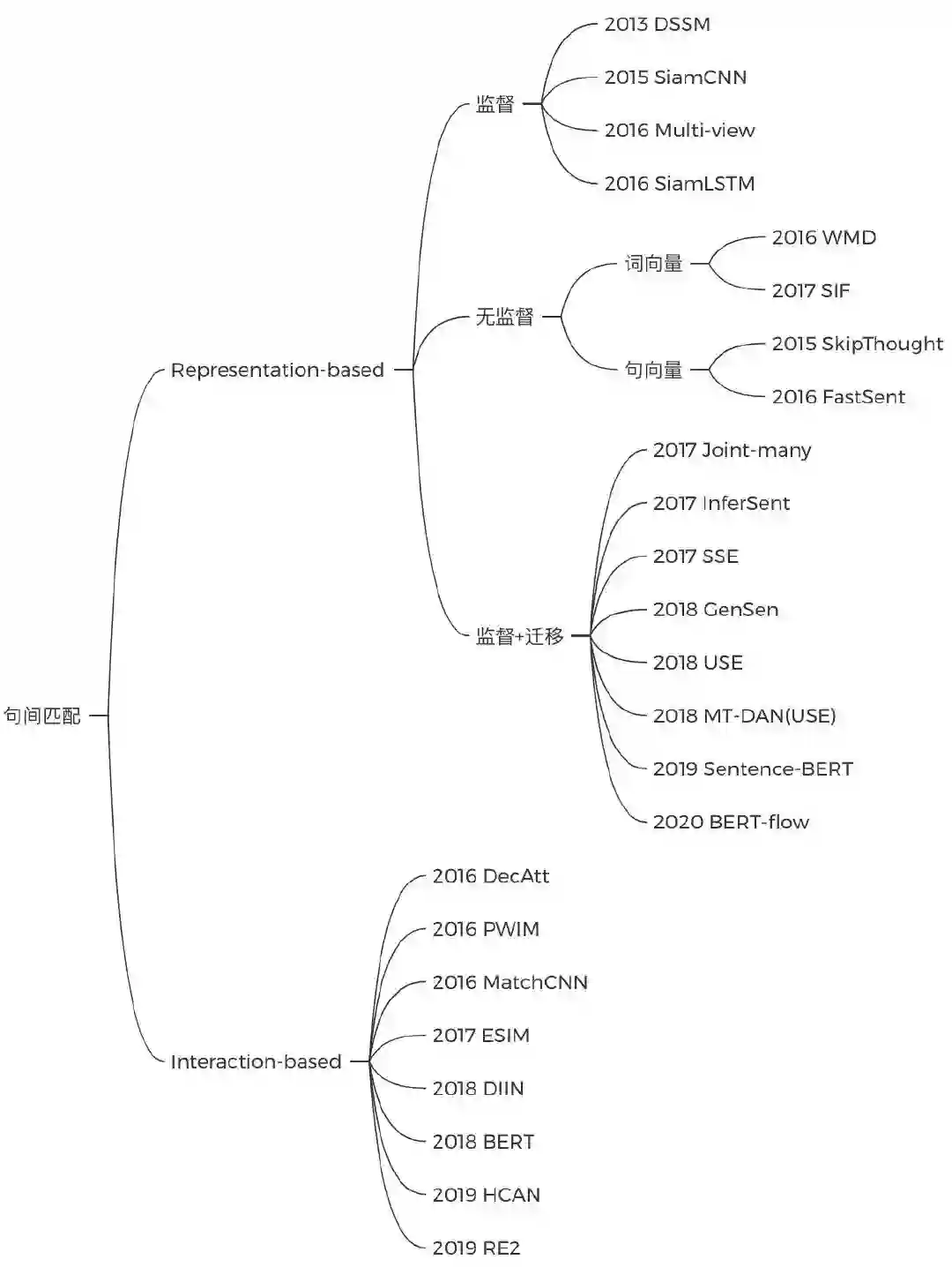 文本匹配会稍微复杂些,它有双塔和匹配两种任务范式。双塔模型可以先看SiamCNN,了解完结构后,再深入优化编码器的各种方法;基于匹配的方式则在于句子表示间的交互,了解BERT那种TextA+TextB拼接的做法之后,可以再看看阿里的RE2这种轻量级模型的做法: