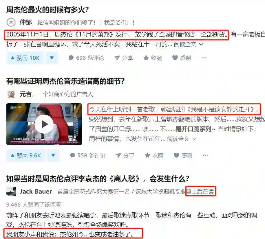 (1)知乎:周杰伦相关精华话题,高赞内容通常这样的画风。多为20岁+的答主,且大多在少年时代就喜欢周杰伦的作品。