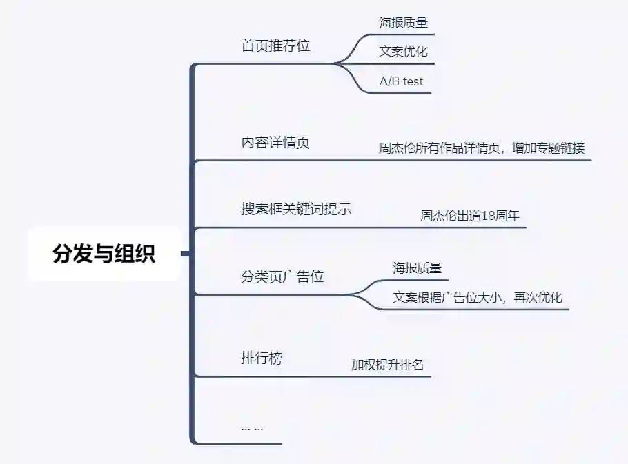 案例:以我们的音乐产品为例,确定了“陪我们走过青春的周杰伦——18年经典曲作”,该怎样做分发与组织?找到可以投放的渠道、推荐位,并根据节点特征进行优化。
