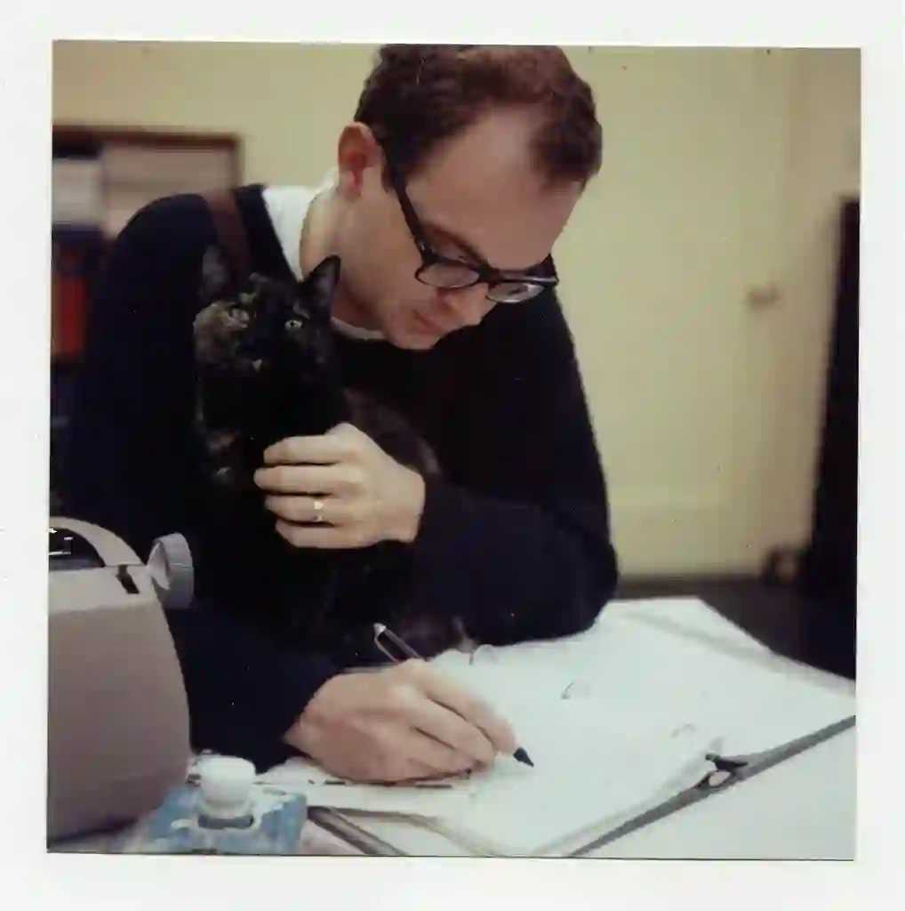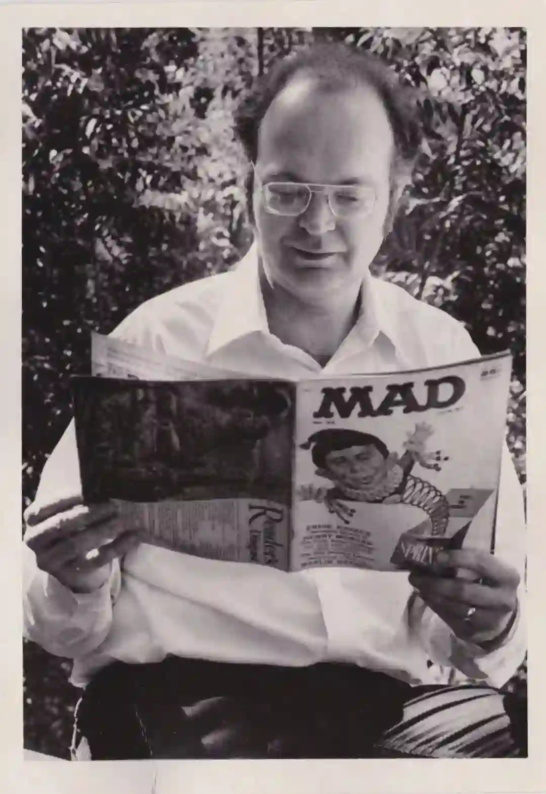 摄于 1981 年,Knuth 正在看 1957 年出版的《疯狂》杂志,这本杂志里有他发表的第一篇技术论文,发表这篇论文的时候他才 19 岁。
