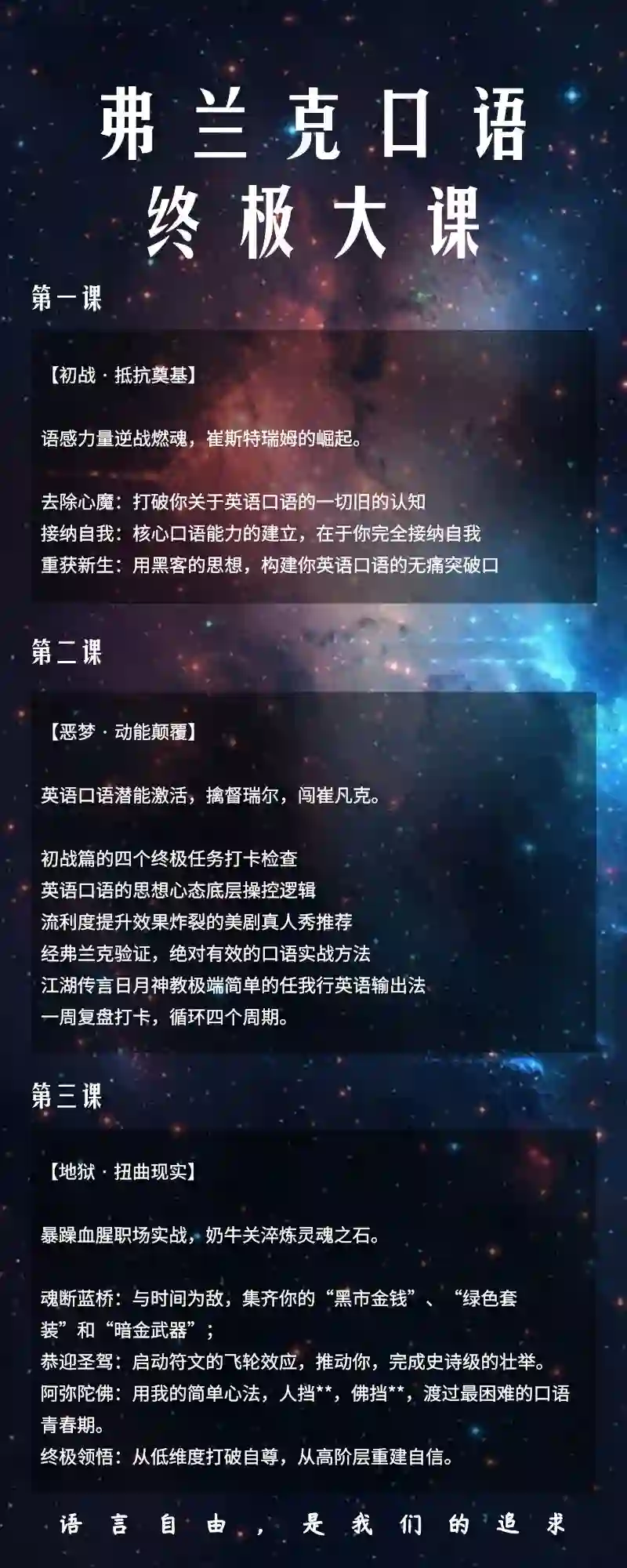 需要提醒的是,我不是告诉你买了课就可以躺着如何如何,我更不想跟你保证「今天买了我的课,明天就能学会口语,走向人生巅峰了」。