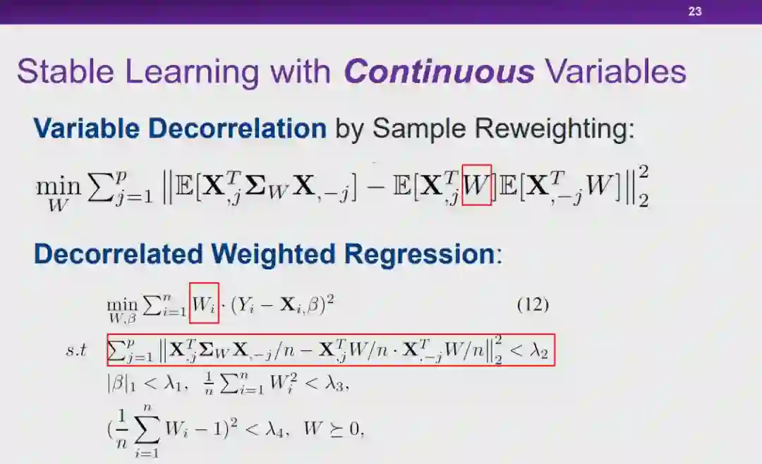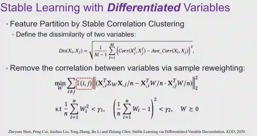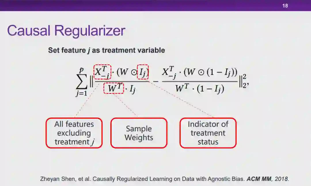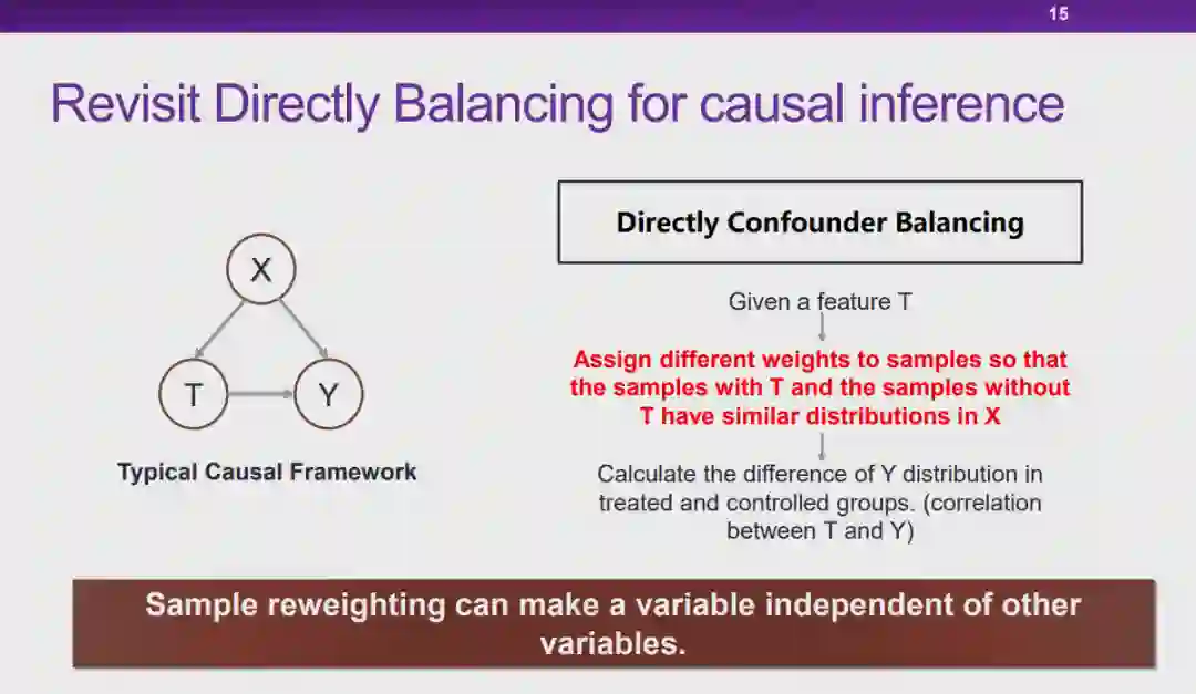 图 14:稳定学习假设我们利用符合分布 1 的训练数据训练机器学习模型,如果我们在测试阶段使用的是同样符合「分布 1」的数据,那么这种情况就是满足独立同分布假设的学习问题。此外,当我们在测试时使用的是与「分布 1」不同的「分布 n」的数据,我们就需要通过迁移学习技术针对「分布 n」对模型进行优化。然而,尽管迁移学习技术可以在一定程度上解决这种特征分布偏移的问题,但它所面临的场景仍然不是最普适性的情况。这是因为,在迁移学习框架下,尽管并不要求测试数据和训练数据的分布必须一致,但是我们需要知道测试数据的分布才能进行进一步的域适应。不幸的是,在实际情况下,我们往往无法控制测试数据如何产生。因此,我们希望在将模型应用到不同的数据分布下的时候,针对准确率的方差进行优化,使准确率的波动可控或者为一个极小的量。同时,另一个需要优化的目标是模型的平均性能。如果我们能够保证模型在不同环境下具有可靠的模型性能,并且能够优化性能波动的方差,那么就可以实现「稳定学习」。图 15:因果推理的平衡我们将基于因果推理中的「混淆变量平衡」的思想来实现稳定学习。在因果推理领域中,如果我们想要根据可观测的数据估计 T 对 Y 的因果效应,首先要控制其余的所有变量 X 不变。然而实际上,当我们将数据划分为 T=0 和 T=1 的两组后,并不能保证两组数据中变量 X 的分布保持一致。因此,我们往往会通过使用「直接混淆变量平衡」(directly confounder balancing),即对试验组和对照组两组数据的样本进行加权,使得这两组数据加权后的 X 分布一致,此时这种设定就可以满足上文中对因果效应的定义。实际上,这种操作是通过样本加权的方式使得 T 和 X 相互独立。当 T 和 X 独立之后,度量 T 与 Y 之间的关联性等价于计算 T 与 Y 之间的因果效应。图 16:全局平衡当我们试图将上述思想推广到机器学习领域中时,一个重要的差异是:在因果领域中,我们度量的是单个变量对输出变量的因果效应,而在机器学习领域中我们需要使用所有的输入变量预测输出变量。因此,稳定学习旨在将上述思想推广到全局的层面上,试图学习一组样本权重,通过样本加权的方式使所有的输入变量之间都相互独立,从而可以利用现有的基于关联的模型实现基于因果的预测。 7