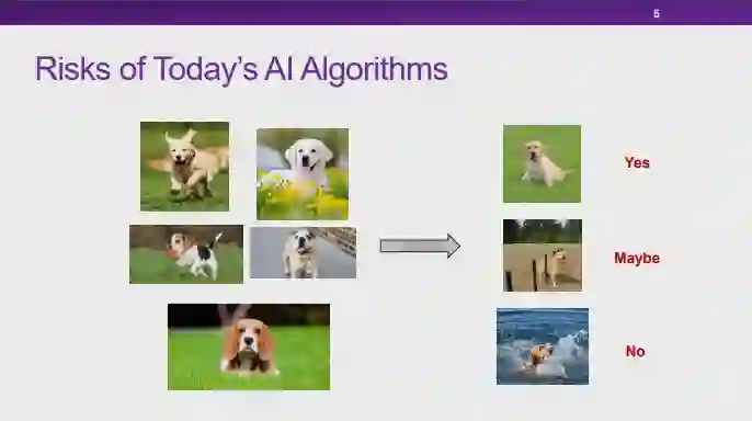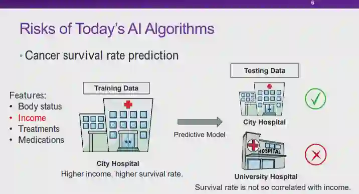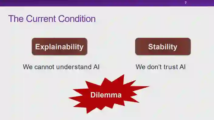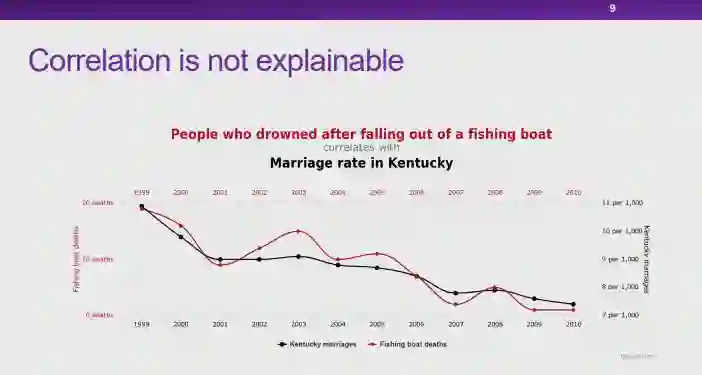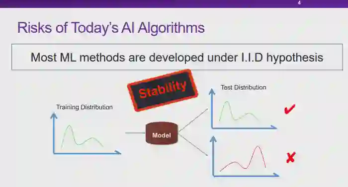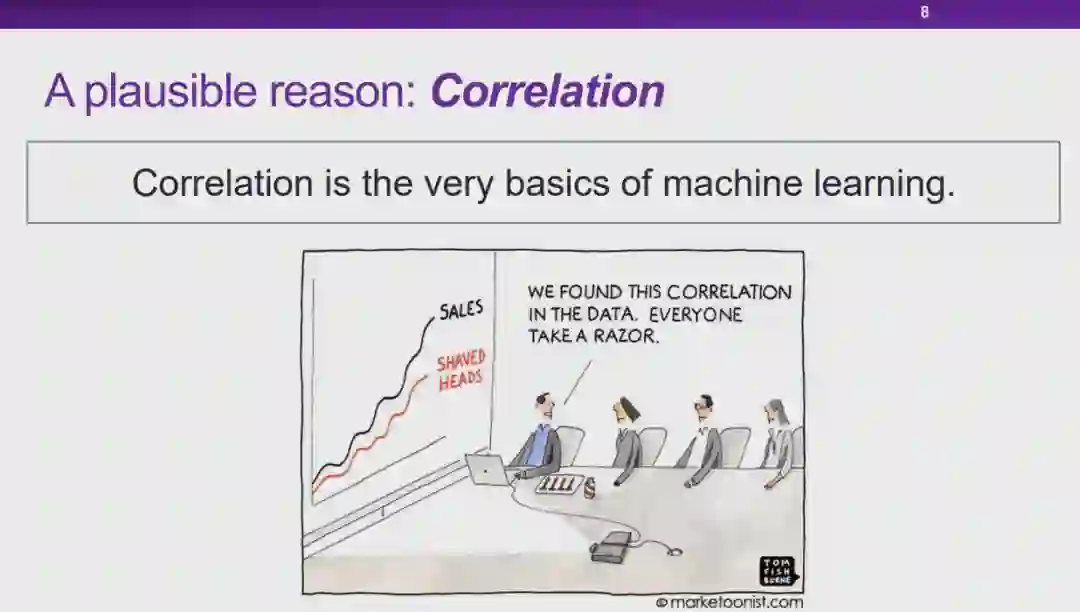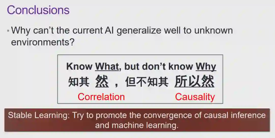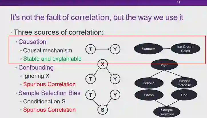 图 7:可解释性与稳定性的困境就当下的人工智能技术而言,由于缺乏可解释性,所以模型的使用者无法理解模型做出预测和决策结果的原因;另一方面,如果模型并不能在各种场景下维持足够稳定的高性能,我们也无法充分信任这些模型。目前,我们面临着人工智能模型的「可解释性」和「稳定性」都不能得以充分保证的窘境。实际上,如果我们能够保证模型具有足够稳定的高性能,对模型「可解释性」的要求在某种程度上也可以适当降低。以汽车驾驶为例,并不是所有人都明白汽车的工作原理,但是由于汽车技术在各个层面上都足够可靠,我们仍然可以安心驾驶汽车。图 8:可能的造成窘境的原因——关联那么,导致当前的人工智能技术面临这种困境的原因是什么呢?在崔老师看来,当前的大多数机器学习模型都是以「关联统计」为基础的,这也许是造成这种困境的原因之一。实际上,关联统计手段在某些情况下会存在一些弊端,可靠性无法得以保证。图 9:无法解释的关联性首先,关联性本身是不可解释的。如图 9 所示,直观地看,红色的曲线与黑色曲线应该高度相关。然而,红色的曲线实际上表示渔船上落水人员的溺死率,而黑色曲线则表示肯塔基州的结婚率。显然,尽管红黑两条曲线相关程度很高,这两份数据其实并没有太大的关系,这种曲线的相关性无法得到解释。当我们把问题推广到大数据环境下任意的两个趋势性变量时,这两个变量可能并不存在任何物理意义上的关系,但是由于变量 A 和 B 同时为增大趋势或同时为减小趋势,基于关联统计的模型就会认为这两个变量正相关;同理,当 A 和 B 的变化趋势相反时,基于关联的模型则会认为这两个变量负相关。然而,我们无法解释这两种趋势变量的关联性。因此,对于基于关联统计构造的模型而言,由于我们本身就无法保证关联性的可解释性,所以也就无法从根本上保证模型的可解释性。图 10:不稳定的关联性另一方面,关联性本身也是不稳定的。如前文所述,关联性的存在与数据分布有很大的关系。如图 10 所示,在训练关于狗的图片分类器时,由于训练数据中包含大量「草地上的狗」,草地和狗的标签之间会形成强相关的关系。当我们在测试时向模型输入「沙滩上的狗」时,图片背景中没有草地,然而模型在训练时会学习到草地和狗之间的强相关性,它会认为背景中没有草地的图片中出现狗的概率也会很小,此时分类模型的置信度也会有所降低。可见,当我们在测试中切换到与训练数据不同的分布时,关联性是不稳定的。因此,许多研究者将目光投向了「因果性」。例如,狗的特征空间中,红色的边界框包含一些训练数据中的相关特征,而黄色的边界框中的特征也与狗的标签高度相关。然而,这两种与标签高度相关的边界框中的特征的性质是不同的,黄色边界框中狗的身体上的特征是「因果特征」。对于人类而言,正是因为人类看到了黄色框中的标签才为图片赋予了狗的标签。当我们依赖「因果特征」进行预测时,即使我们在测试中更换到与训练数据不同的分布,这种因果结构很可能可以保证模型的稳定性,进行更稳定的预测。 4
