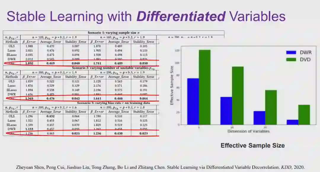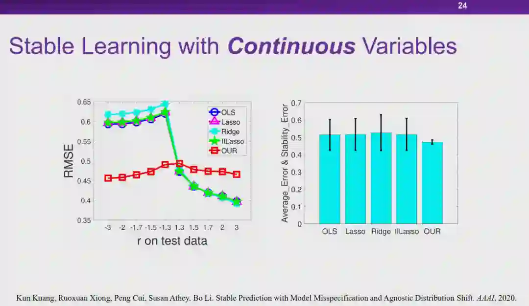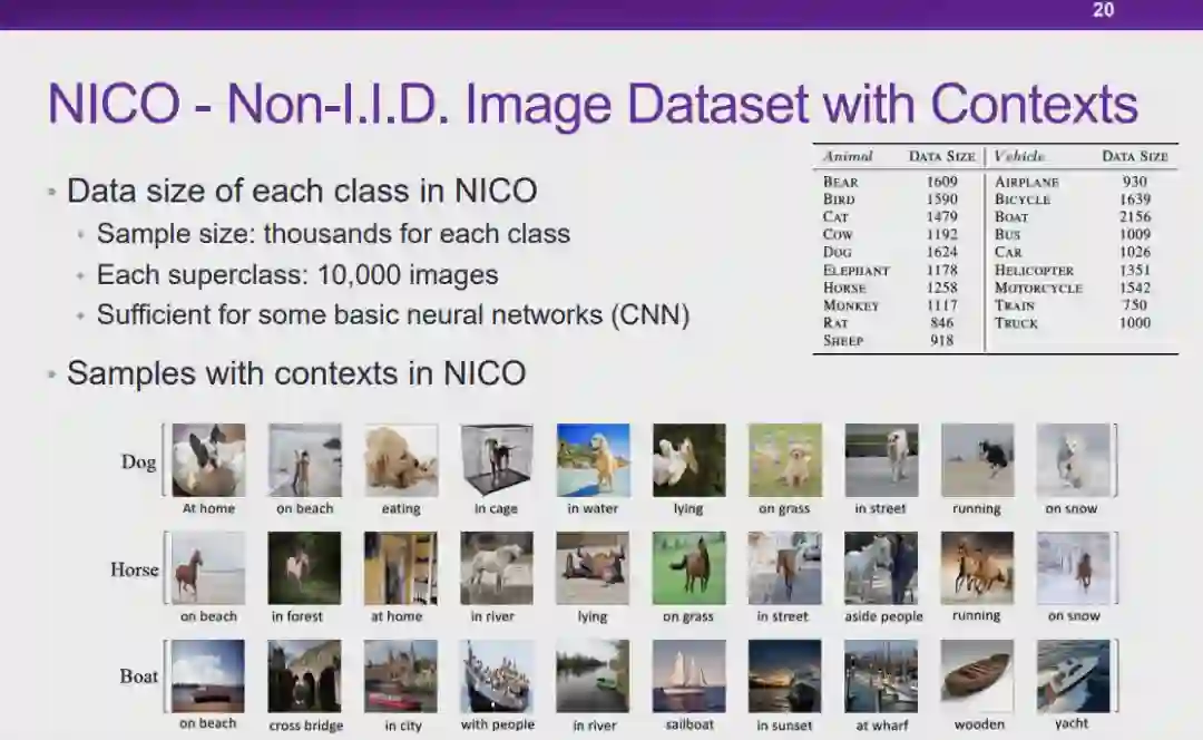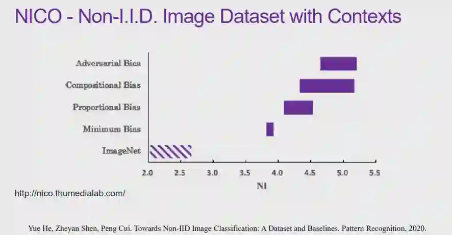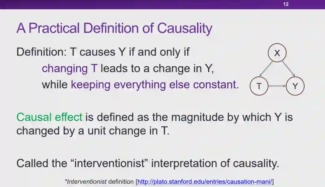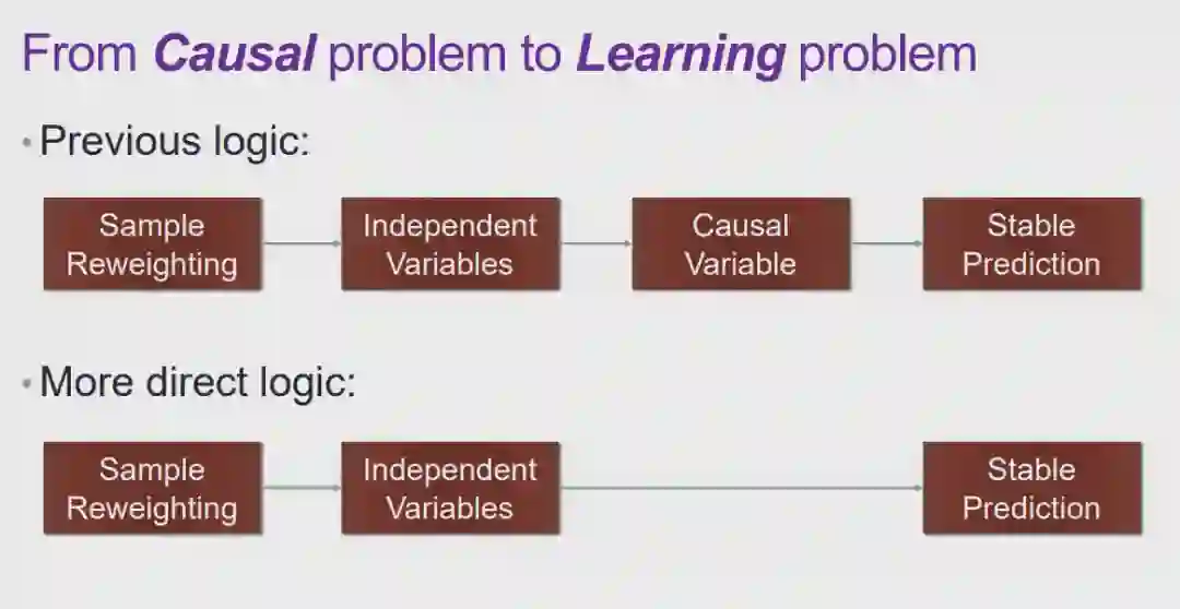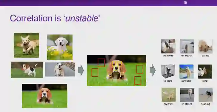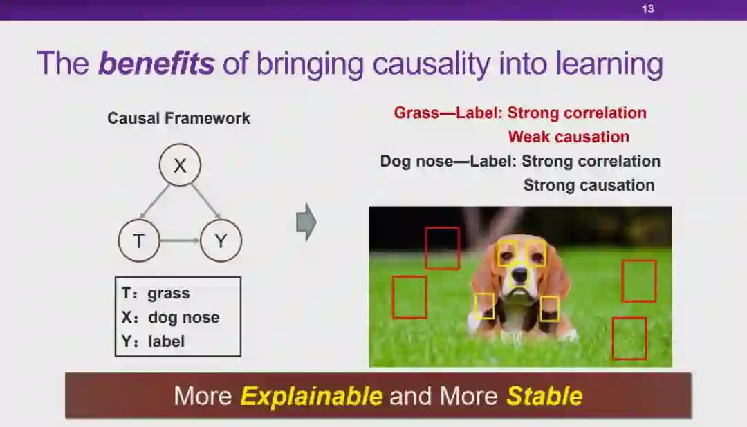 图 12:因果的定义实际上,人们很难在定义「因果」的问题上达成共识。从哲学的视角上看,「如何定义因果」、「因果是否存在」都是具有争议的问题。但是从机器学习研究者的角度来说,我们更加关注是否存在一种更好的统计的方式,能够发现数据之间存在的更本质的关联。在此,我们将为「因果」给出一个实用性的定义。在如图 12 所示的三角形框架中,为了探究 T 是否会导致 Y,我们首先控制住除变量 T 之外所有其它的变量 X。在控制 X 不变的条件下,我们对 T 施加一定的影响,如果 Y 会随着 T 的变化而变化,我们则称 T 对 Y 有因果效应。我们将因果效应的大小定义为:对 T 施加单位扰动时,Y 发生变化的程度。以上就是从干预的角度出发,对因果的一种解释。图 13:将因果引入机器学习的好处将因果的概念引入机器学习领域,会带来一系列好处。在上文中提到的对狗的图像进行分类的例子中,「草」和狗的标签、「狗的鼻子」和狗的标签之间都存在强关联,从关联的层面上说二者区别不大。然而,从因果的层面上来看,假设 T 代表「草」、Y 代表狗的标签。给定两组数据,在其它特征(例如,狗的鼻子)都相同的情况下,一组数据中有草地,另一组数据中没有草地。我们会发现,这两组数据中狗的标签的百分比分布并没有显著差别。这是因为只要图片中出现了狗的鼻子,无论出现草地与否,都会包含狗。在这种情况下,我们会发现「草」对标签 Y 实际上并没有因果效应。相对应地,如果令 T 代表「狗的鼻子」,在两组数据中都出现草地的情况下,一组包含狗的鼻子,另一组不包含狗的鼻子,则两组数据中 Y 的百分比分布肯定会存在差异。因此,通过度量,我们发现「狗的鼻子」对狗的标签有因果效应。在因果的框架下进行度量时,「草」对于狗的标签存在非常弱的因果关系,而「狗的鼻子」和狗的标签存在非常强的因果关系。可见,如果我们在学习问题中依赖「因果」进行预测,模型的可解释性和稳定性都会得到提升。在此基础之上,崔老师的团队提出了「稳定学习」的概念。 6