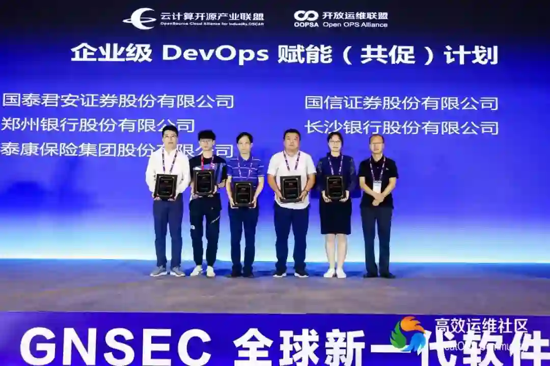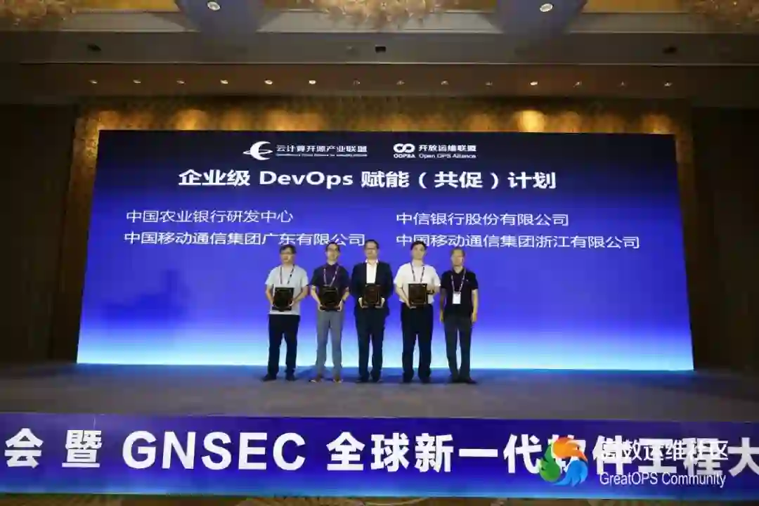 主持人宣布此次加入企业级 DevOps 赋能(共促)计划的企业,分别是中国农业银行研发中心、中信银行股份有限公司、中国移动通信集团广东有限公司、中国移动通信集团浙江有限公司、国泰君安证券股份有限公司、国信证券股份有限公司、郑州银行股份有限公司、长沙银行股份有限公司、泰康保险集团股份有限公司。