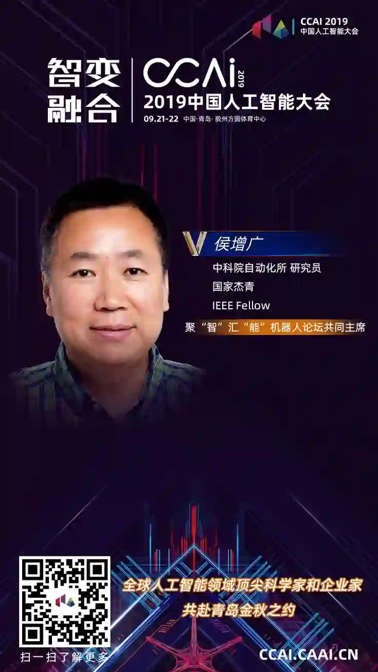 2019年中国人工智能大会(Chinese Congress on Artificial Intelligence 2019,简称“CCAI 2019”)将于在9月21日-22日在青岛胶州召开。侯增广教授将出席大会并担任聚“智”汇“能”机器人论坛共同主席。