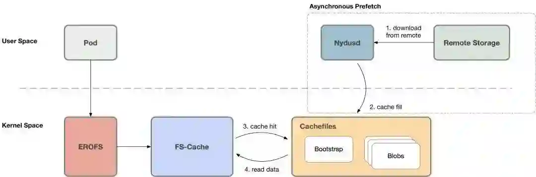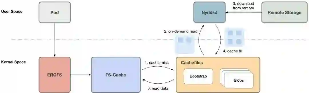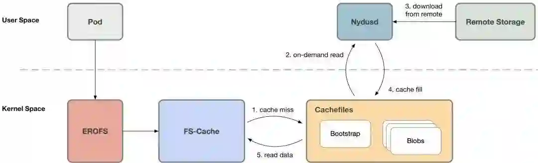 否则 (cache miss) 需要通知用户态的 Nydusd 进程以处理这一访问请求,此时容器进程会陷入睡眠等待状态;Nydusd 通过网络从远端获取数据,通过 fscache 将这些数据写入对应的缓存文件,之后通知之前陷入睡眠等待状态的进程该请求已经处理完成;之后容器进程即可从缓存文件读取到数据。