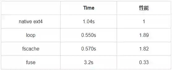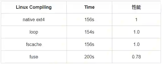 可以看到,fscache 模式下的 Linux 编译负载性能与 loop 模式、原生 ext4 文件系统的性能基本持平,同时要优于 fuse 模式。