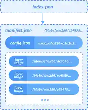 先看一下 OCIv1 标准镜像,OCIv1 格式是一种基于 Docker Image Manifest Version 2 Schema 2 格式的镜像格式规范,由 manifest、镜像索引 (optional)、一系列容器镜像层及配置文件组成,细节可以参见相关文档,本文不再赘述。本质上说 OCI 镜像是一个以层为基本单位的镜像格式,每个层存储了文件级别的 diff data,以 tgz 归档格式存储,如下所示: