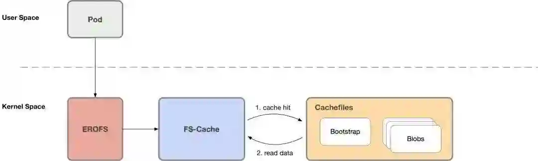 事实上我们可以将按需加载的 1) 缓存管理和 2) 缓存未命中的时候,通过各种途径 (例如网络) 获取数据 ,这两个操作解耦开。缓存管理可以下沉到内核态执行,这样当镜像在本地 ready 的时候,就可以避免内核态 / 用户态上下文的切换。而这也正是 erofs over fscache 技术的价值所在。