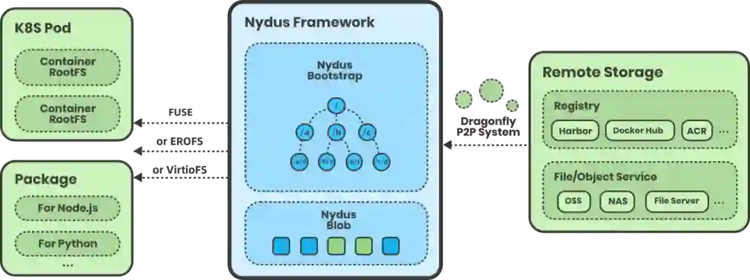 本文将从 Nydus 架构回顾、RAFS v6 镜像格式和 EROFS over Fscache 按需加载技术三个角度来分别介绍这一技术的演变历程,并通过对比数据展示了当前方案的卓越性能,希望大家能够尽早享受到容器启动飞一样的体验!