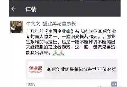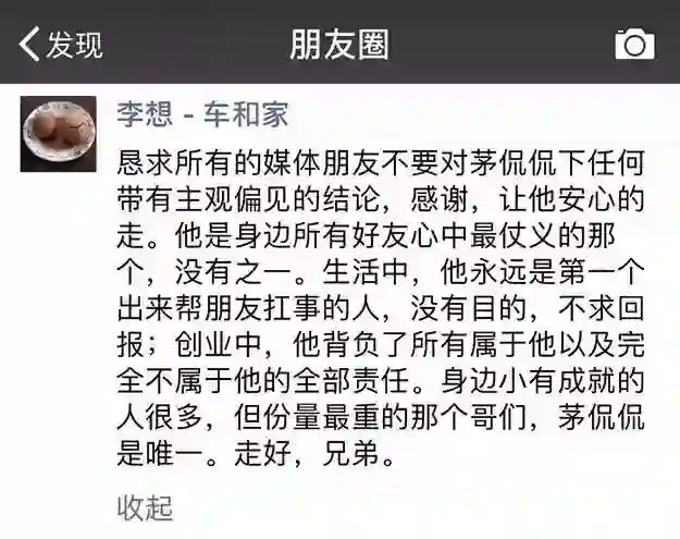 恳求所有的媒体朋友不要对茅侃侃下任何带有主观偏见的结论,感谢,让他安心的走。他是身边所有好友心中最仗义的那个,没有之一。生活中,他永远是第一个出来帮朋友扛事的人,没有目的,不求回报;创业中,他背负了所有属于他以及完全不属于他的全部责任。身边小有成就的人很多,但份量最重的那个哥们,茅侃侃是唯一。走好,兄弟。