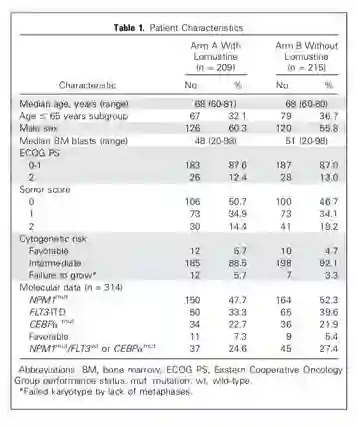 2008年2月至2011年12月,该研究共招募了459例患者,最终227例和232例患者被随机分至A组(联合洛莫司汀)和B组(不联合洛莫司汀),两组中分别有209例和215例纳入分析。经评估两组患者的临床特征大致平衡(Table 1),中位年龄均为68岁,多数患者的ECOG PS和Sorror评分较低,90%的患者为细胞遗传学中危组。286例患者筛查了FLT3、NPM1和CEBPA的突变状态。
