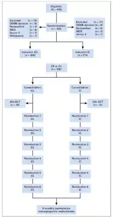 自2008年2月至2011年12月,该研究纳入了来自法国32个中心的459例年龄60-65岁老年AML患者(除急性早幼粒细胞白血病和孤立性粒细胞肉瘤之外),入组患者被随机分配至联合或不联合洛莫司汀的诱导化疗和巩固治疗组。诱导治疗方案为伊达比星8 mg/m2/d IV d1-5,阿糖胞苷100 mg/m2/d IV d1-7,联合(ICL)或不联合(IC)洛莫司汀200mg/m2 po d1。1个诱导化疗疗程后未获CR或CRi的患者不再接受二次诱导化疗,获得CR或CRi的患者则继续接受巩固治疗,方案为伊达比星8 mg/m2/d IV d1-3,阿糖胞苷50mg/m2 q12h IV d1-5,联合(ICL)或不联合(IC)洛莫司汀80mg po d1,1个巩固疗程后继续进行6个疗程的减量再诱导治疗,方案为:伊达比星8 mg/m2/d IV d1,阿糖胞苷50mg/m2 q12h IV d1-5,联合或不联合洛莫司汀40mg po d1。随后是包括6-巯嘌呤和甲氨蝶呤在内的6个月维持治疗。研究设计的具体流程见Figure1。本研究的主要目标为2年OS,次要目标为反应率,2年无事件生存率(EFS)和安全性。同时,本研究亦评估了累计复发率(CIR)和药物毒性所致的死亡率。