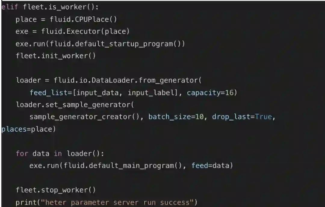 为了能让广大用户快速上手异构参数服务器训练架构,飞桨在操作方面做的也比较简单,不仅配有成熟的脚本么,并且仅需要补充简单的几行代码,就可以将传统参数服务器训练架构修改为异构参数服务器架构。