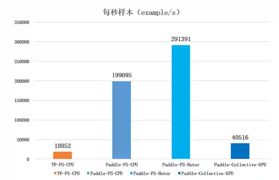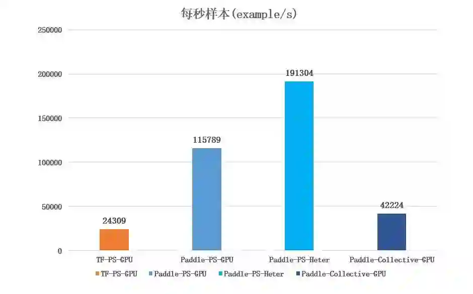 然后改为使用 GPU 的架构进行测试,且统一使用 4 台 GPU 机器,可以看到常用于复杂网络计算的 Collective-GPU 架构的表现一般,都远不如 PS-GPU 和 PS-Heter(4CPU+4GPU)架构,而其中 PS-Heter 性能依然保持着优异的性能。