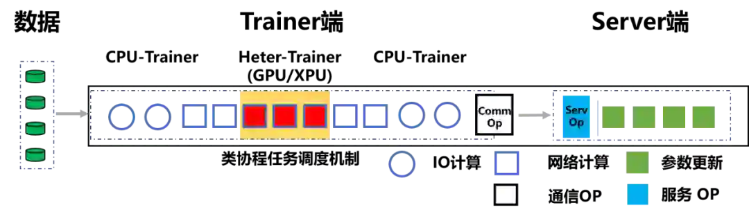 值得注意的是,异构参数服务器架构并不只是简单的将计算任务拆分。拆分后,异构硬件间的通信代价高的问题也需要解决。为了解决这个问题,飞桨的整个传输通信过程得到了优化。该过程将不会完全依赖于硬件自身的吞吐,而是引入类协程任务调度机制,该机制采用了异步等待和多 Queue 流水线等方式对任务进行灵活调度,避免传输队列阻塞,对任务进行灵活调度,并且还优化了 Heter-Trainer 的吞吐机制,高效的避免传输队列阻塞。