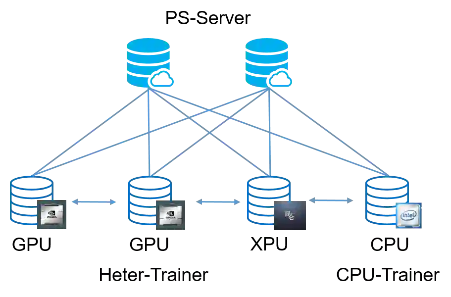 飞桨的异构参数服务器架构不仅可以支持 CPU 机器、GPU 机器和 XPU 机器的混合模式,而且支持全部 CPU-Trainer 或 GPU-Trainer 的那样的传统参数服务器的硬件组合,甚至在 GPU 单类型机器的集群内采用 Heter 模式,可以达到训练提速的效果。