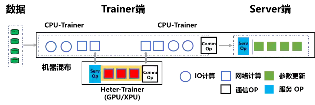 ,原先那样粗粒度的任务分工显然不再适用,只有让不同硬件参加到训练任务中,并在自己最擅长的领域工作,才能各显神通。因此飞桨的研发人员在传统的 CPU-Trainer 之外,又部署了一类 Heter-Trainer,并在 Heter-Trainer 上配置有 Service。这样 CPU-Trainer 便将 Heter-Trainer 视为特殊的 Server,从而对 Heter-Trainer 的异构算力不敏感,使 Heter-Trainer 可以混部各类不同型号芯片(例如 GPU 或 XPU 等)。