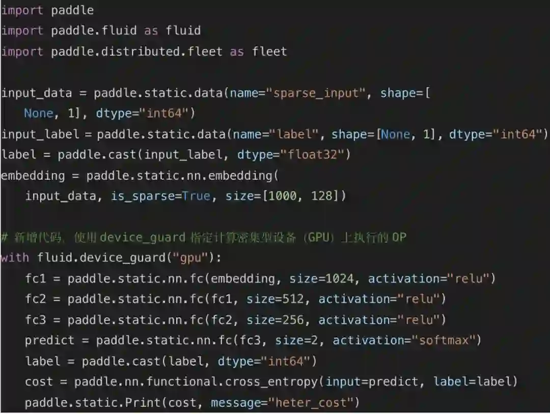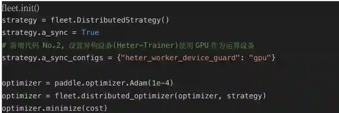 3. 调用 Paddle 分布式 Fleet API,添加运行策略,设置异构设备 (Heter-Trainer) 使用 GPU 作为运算设备,然后完成反向组网。
