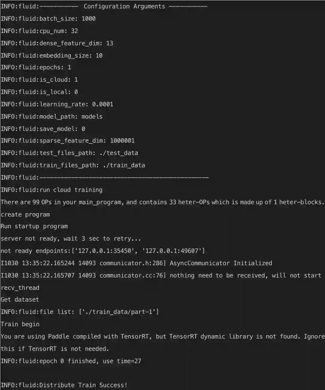 飞桨对分布式训练的启动代码进行了易用性封装,使用 fleetrun 命令即可快速启动分布式训练: