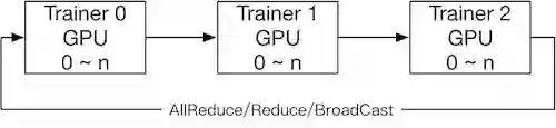 在 Collective 架构中,集群中存在多个地位平等的 Trainer(也可以叫 Worker)。在数据并行的方式下,每个 Trainer 上都保存一份完整的模型网络结构和模型参数,在前向和反向计算过程中,每个 Trainer 使用自己划分的数据(shard)进行计算,得到对应的梯度;然后 Trainer 之间通过 All-Reduce 等通信方式同步梯度到所有 Trainer,最后每个 Trainer 使用同步后的梯度独立完成参数更新。
