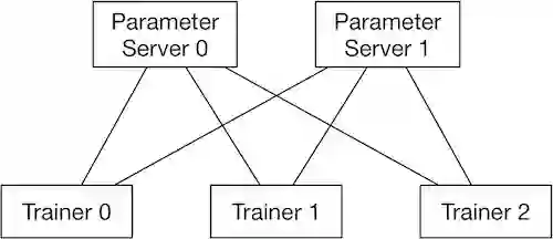 再来看看参数服务器架构。与 Collective 相比,参数服务器架构中除了 Trainer 之外还有一个角色叫 Server。在执行前向与反向计算过程中,Server 负责从各个 Trainer 收集汇总梯度,然后使用这些梯度信息计算更新参数,并向各个 Trainer 分发更新后的参数信息。