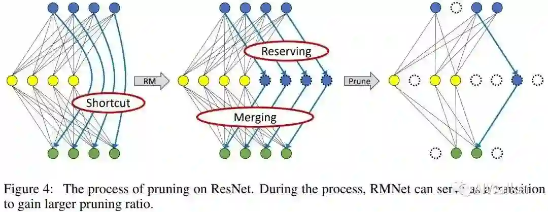 具体来说,我们首先训练ResNet并稀疏化BN层的权值。在完成训练后,我们将ResNet转换成RMNet并根据BN层权值进行剪枝。上图对剪枝过程进行了可视化,RMNet可视作更大剪枝比例的过渡。