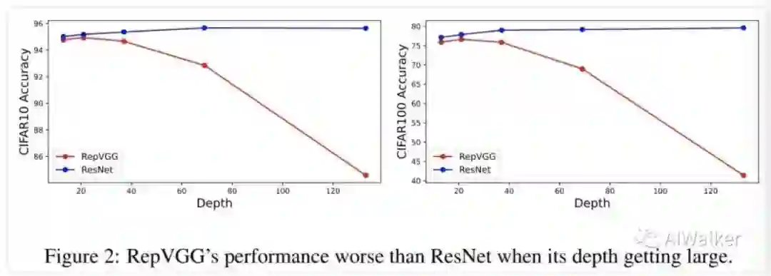 上图研究了深度对于ResNet和RepVGG的性能影响,从中可以看到:随深度提升,ResNet取得越来越好精度,这与前述分析相一致;而RepVGG的精度则会下降 。比如,ResNet-133的精度为79.57%@CIFAR100,而RepVGG-133的仅为41.38%@CIFAR100。(PS:为啥我就这么信不过呢??? )