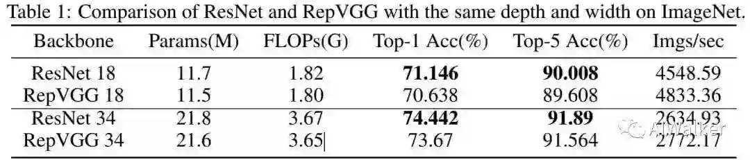 上图还给出了ImageNet数据集上的性能对比,从中可以看到:ResNet-18的性能要比RepVGG-18高0.5%;ResNet-34的性能要比RepVGG-34高0.8%。因此,RepVGG以损失表达能力为代价进行速度提升。