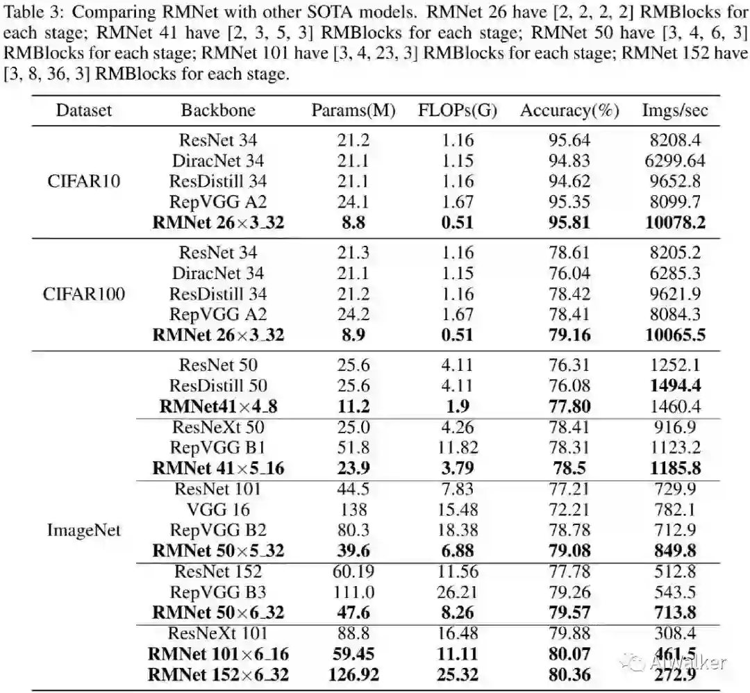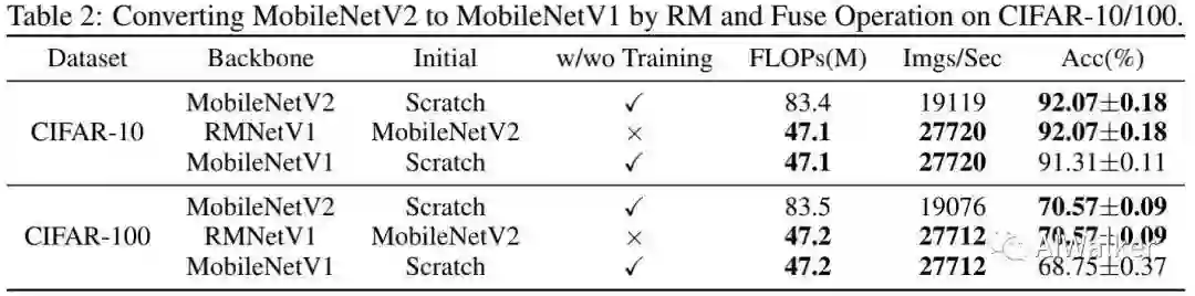 RMNet经过参数量后等效于MobileNetV1,这就非常有意思了:MobileNetV2是通过利用残差连接提升MobileNetV1的性能而得到,而RM与参数融合则将MobileNetV2退化回MobileNetV1了 。是不是可以说:RM让MobileNetV1再次伟大 !