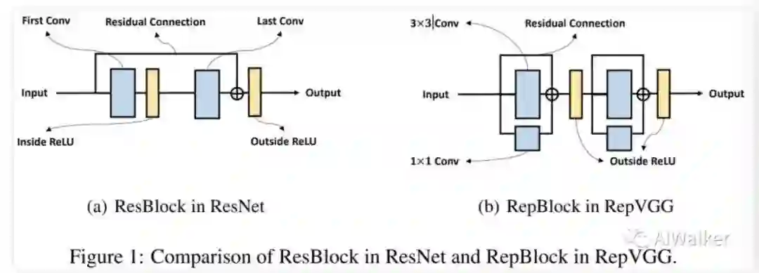 上图给出了ResNet与RepVGG中的基础模块示意图,可以看到:在ResBlock中,两个ReLU分别位于残差连接内外;而在RepBlock中,两个ReLU均位于残差连接之外 。由于重参数是基于乘法交换律,故ReLU需要位于残差连接之外方可进行结构重参数化。当然,我们采用两个RepBlock替换一个ResBlock,接下来,我们将从forward与backward两个角度分析为何RepVGG无法像ResNet那样深 。