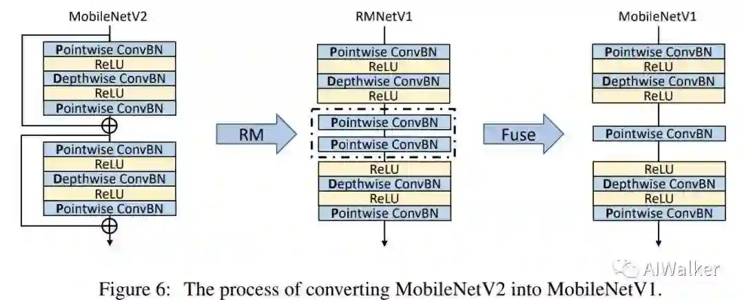 上图给出了MobileNetV2经由RM处理到RMNetV1的示意图,此时残差连接被移除,导致了两个连续的Pointwise-ConvBN层(见上图虚线部分)。由于两个Pointwise ConvBN之间无非线性操作,故他们可以进一步融合。融合公式描述如下: