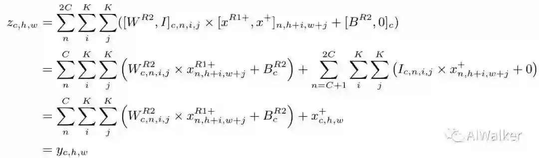 Merging 我们对Conv2的输入通道进行扩展并通过direc初始化。z的第i通道等于原始滤波结果输出 的第i通道相加。整个合并过程表示如下: