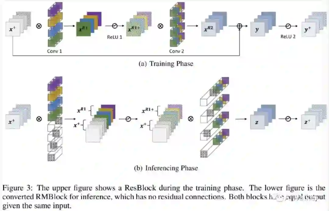 本文在ResBlock上实施RM(Reserving and Merging, RM)操作移除残差连接,将ResNet等价转换为类VGG架构,取得了更好的精度-速度均衡。>>加入极市CV技术交流群,走在计算机视觉的最前沿