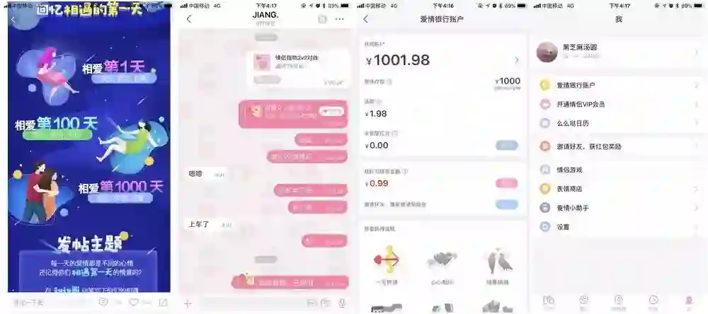 平台支持情侣双方通过聊天、视频、玩游戏和秀恩爱维系感情,是一款情侣专属的沟通工具。“爱情银行”有其独特的“银行”属性,用户使用App每日打卡记录爱情日程,当他们所存储的“感情记忆”满365天后,即可提取他们通过努力“赚取”的存款。