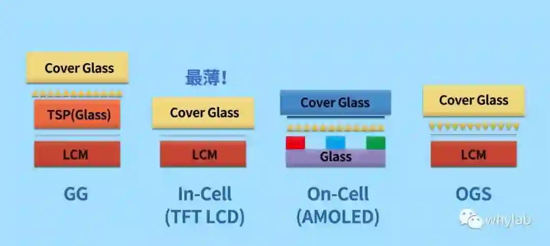 再来说说外挂式薄膜触控方案,有 GF 和 GFF,区别都在图里。