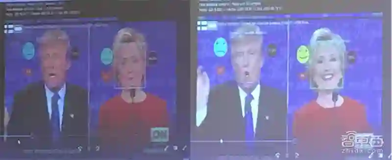除了介绍相关算法外,Matti Pietikainen还展示了这些研究的一些应用场景,并分享了几个有趣的实例视频。比如机器可以在川普和希拉里的竞选视频中根据两人的动态表情变化实时分析出他们在那一刻的心情。