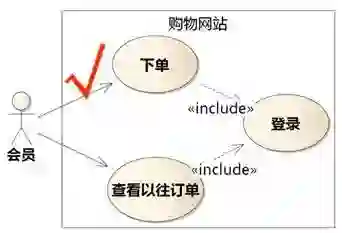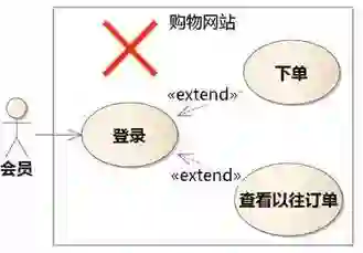 会员登录以后可以下单,也可以查看以往订单,还可以退货……所以图6-5把下单、查看以往订单画成登录的扩展。这是错的。并不是先做A然后做B,B就成了A的扩展。例如,张三先吃饭,然后可能看电视,也可能上厕所,也可能散步。如果把看电视、上厕所、散步画成吃饭的扩展,意思就成了“张三可能会以上厕所的方式吃饭”或 “上厕所是张三达到吃饭目标的一条路径”。