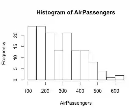 接下来,我生成了一个数据直方图,通过输入 hist(AirPassengers); 得到,这会以图形的方式显示此数据集;RStudio 可以将数据导出为 PNG、PDF、JPEG、TIFF、SVG、EPS 或 BMP。