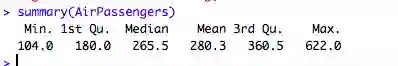 数据导入后,我使用 summary(AirPassengers) 命令获取数据的一些初始描述性统计信息。按回车键后,我得到了 1949-1960 年的每月航空公司旅客的摘要以及其他数据,包括飞机乘客数量的最小值、最大值、四分之一位数、四分之三位数、中位数以及平均数。