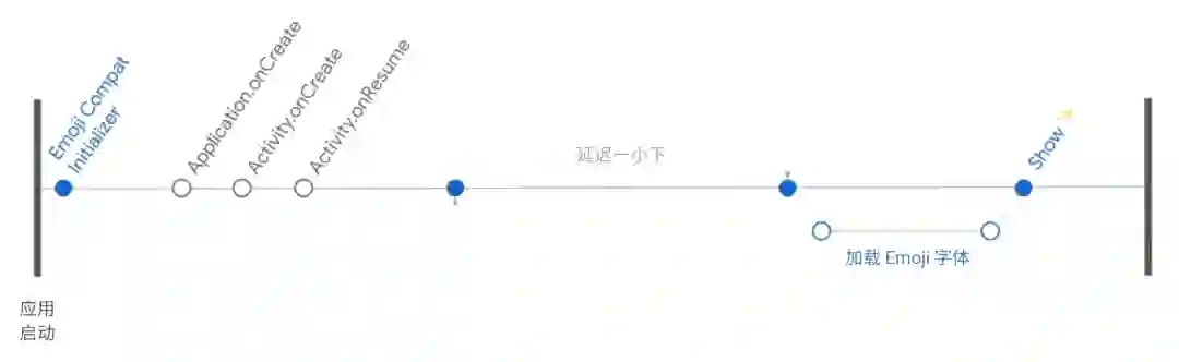 在这次更改中,一大新特性便是 EmojiCompatInitializer,它是一个使用了 androidx.startup 库的初始化程序,在应用启动时会自动配置 EmojiCompat。我们已对该初始化程序的性能进行了大量的调整,对于大多数应用来说使用默认配置已经完全足够,但如果您需要对应用启动做纳秒级别的优化,则可以考虑移除 startup 库和创建线程所带来的消耗。首先,确保先初始化 EmojiCompat,再执行 Activity.onCreate,这可以保证每个 TextView 都能显示新版 Emoji。然后,可以像 EmojiCompatInitializer 一样将 Emoji 字体加载延迟到首屏绘制之后,这样做是因为虽然加载过程是在后台线程中进行的,但它还是执行大量的网络和磁盘 I/O 操作,这些操作会同首屏加载一起抢夺资源。