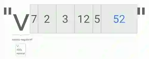 首先,Android 会根据码点和应用要求使用的字体样式为每个字符找出最佳字体。当前 Android 上非斜体且正常粗细 "V" 的默认字体是 roboto-regular.ttf,Android 会对字符串进行遍历,检查每个字符并查找最佳字体。它会检查码点和样式,您可以对字符串进行样式的定制操作,比如对一些字符进行加粗等等。对于上述简单的字符串来说,它就只是会选择 roboto-regular.ttf 字体。