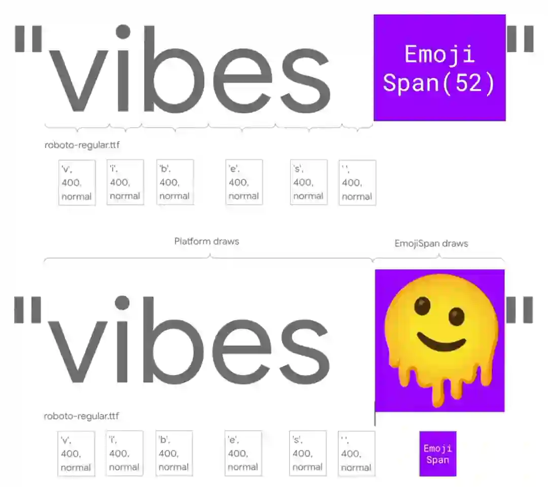 在该 Span 中 Android 使用了两个方法,首先,它会获取字符尺寸并告诉 Android 要在文本布局中为此 Span 保留多少空间,然后,当需要绘制字符串时,它将调用 EmojiSpan 上的 draw 而非自行绘制。在 EmojiSpan 中,它知道 Compat 版的 Emoji 字体位置,并能直接从中绘制出 "融化脸"。再返回到渲染阶段,平台将调用 EmojiSpan.draw,整个区域将由 EmojiSpan 进行绘制,而非平台。实际上,从平台的角度来看 EmojiSpan 只是在字符串中间绘制了一张图片,并没有别的特殊操作。