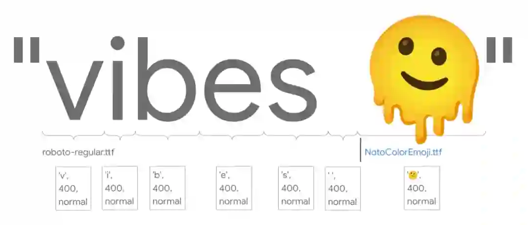 但是,当遇到 Emoji 字符时,您可能会觉得它会进行完全不同的渲染方式,毕竟它看起来不像任何其他的字母。但实际上,Emoji 就是个文本,由码点表示,同字母 "I" 和 "I" 一样没什么区别,绘制它的方式就存储到了字体中。Android 会首先尝试在字体中查找无斜体且正常粗细的 "融化脸",但这一次发现在 roboto-regular 中并没有想要的结果,便会去 NotoColorEmoji 中进行查找,这是 AOSP 上预装的 Emoji 字体,它包含了每个 Emoji 的图像,在 Android 平台上通过这种字体绘制 Emoji 和绘制字母 "I" 的方式完全相同,都是查找字体文件后在屏幕上绘制出来。